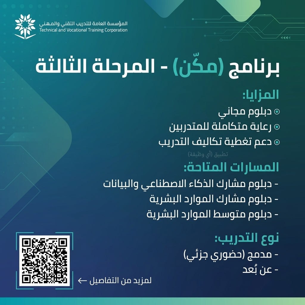 (🔴) برنامج (مكّن) المجاني من التدريب التقني (للجنسين) لحملة الثانوية العامة: