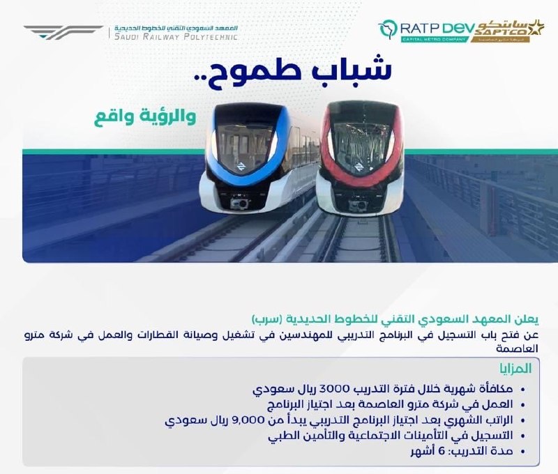 🌟المعهد السعودي التقني للخطوط الحديدية (سرب) يعلن فتح باب التسجيل في البرنامج التدريبي للمهندسين في تشغيل وصيانة القطارات