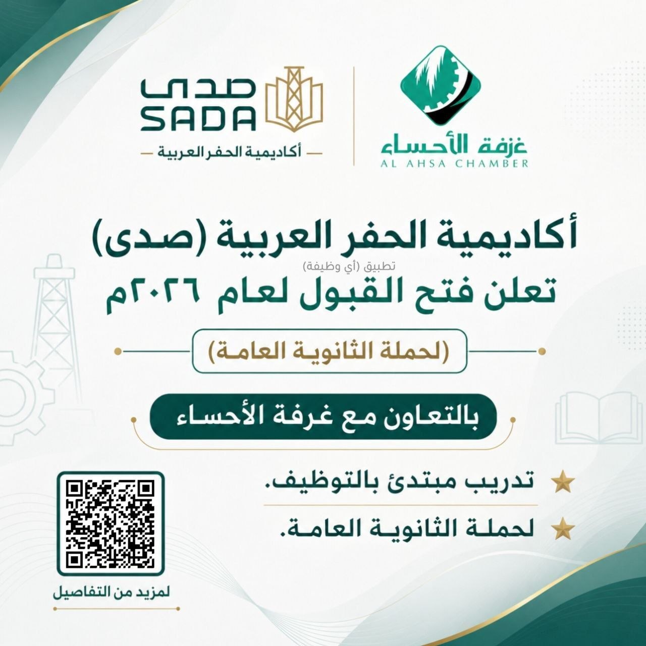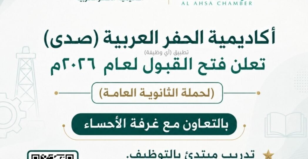 (🔴) أكاديمية الحفر العربية (صدى) تعلن فتح القبول لعام ٢٠٢٦م (لحملة الثانوية العامة) بالتعاون مع غرفة الأحساء: