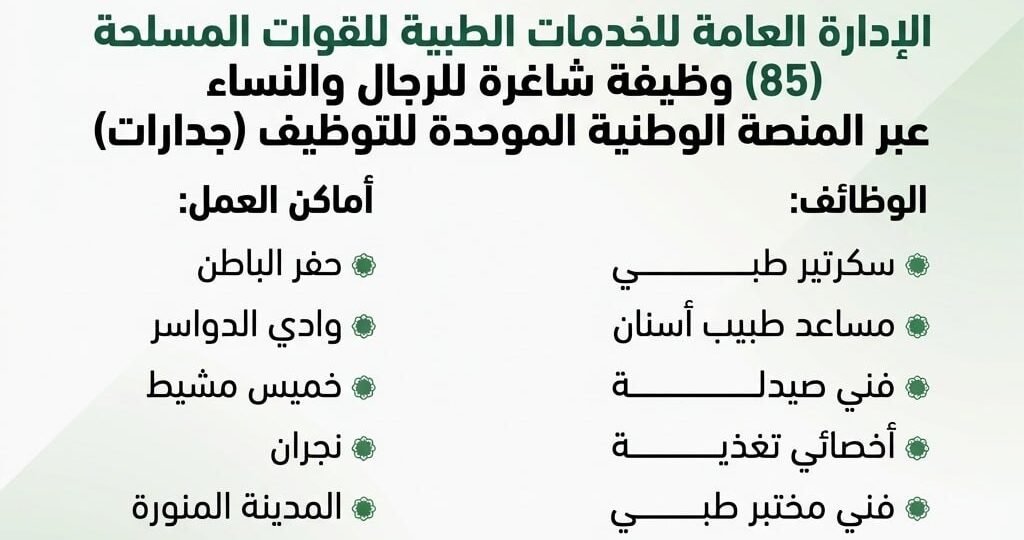 (🔴) الخدمات الطبية (وزارة الدفاع) للقوات المسلحة (وظائف شاغرة بعدة مناطق بالمملكة):