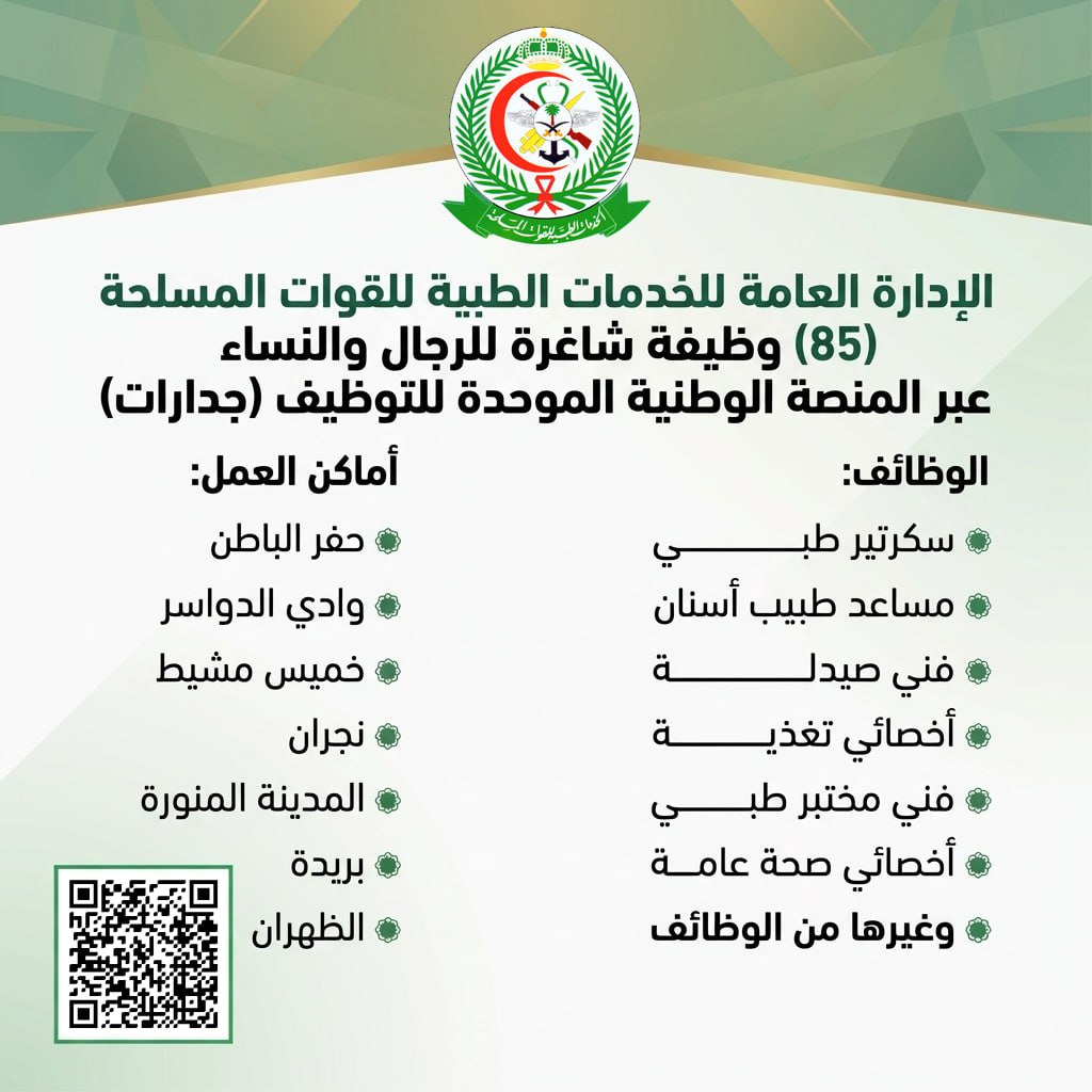 (🔴) الخدمات الطبية (وزارة الدفاع) للقوات المسلحة (وظائف شاغرة بعدة مناطق بالمملكة):