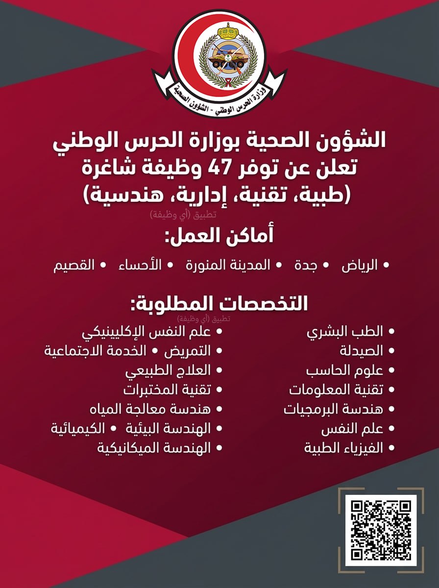 (🔴) الشؤون الصحية بوزارة الحرس الوطني تعلن ٤٧ وظيفة شاغرة (للجنسين) في عدة مناطق بالمملكة: