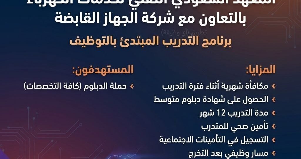 (🔴) المعهد السعودي لخدمات الكهرباء (بالتعاون مع شركة الجهاز القابضة) يعلن برنامج (التدريب المبتدئ بالتوظيف):