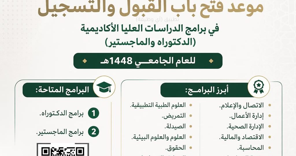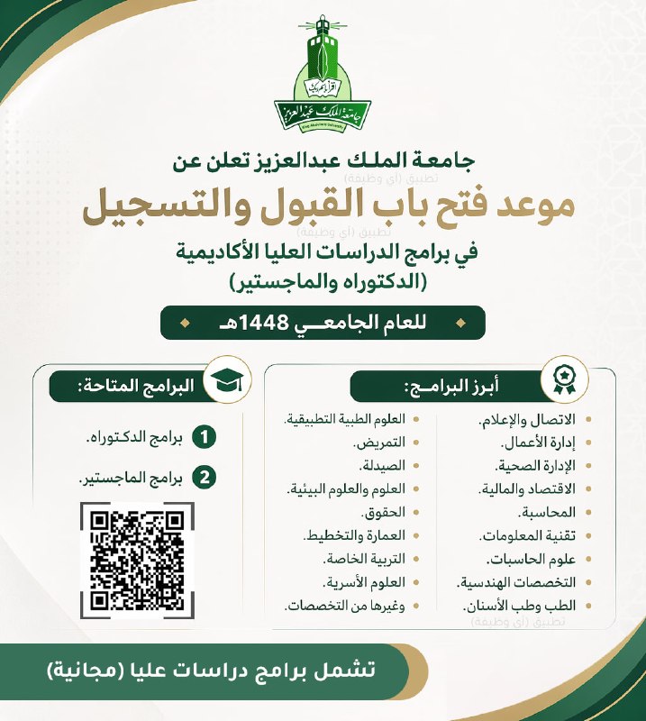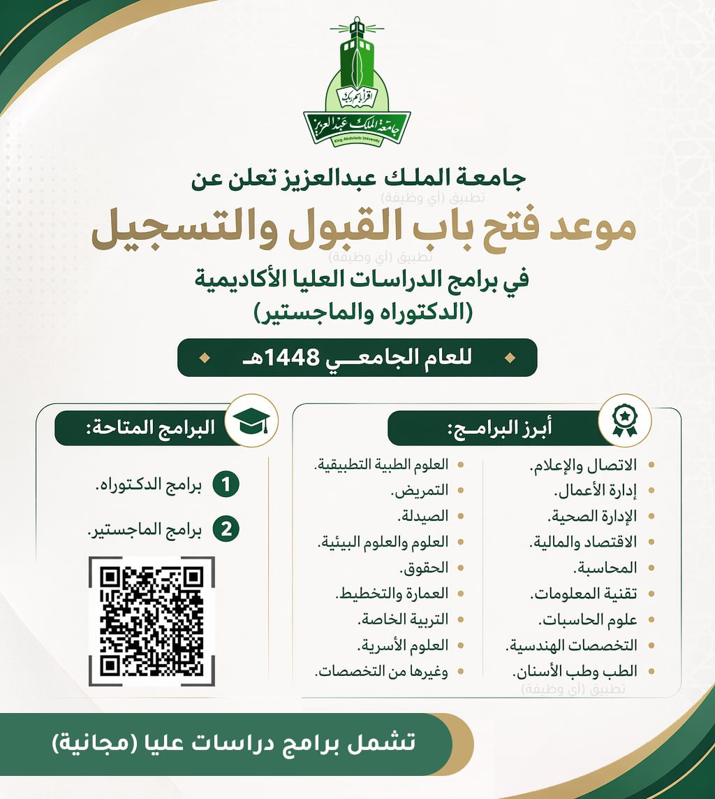 (🔴) برامج دراسات عُليا (مجانية) جامعة الملك عبدالعزيز تعلن عن استمرار القبول في برامج الدراسات العليا (تنتهي قريبًا ‼️):