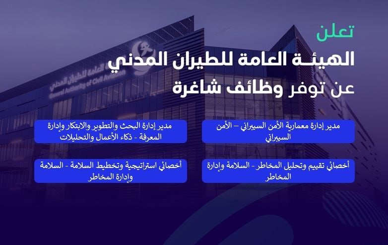(🔴) توظيف | الهيئة العامة للطيران المدني توفر ٤وظائف شاغرة (رجال ونساء) في التخصصات (الإدارية – الهندسية – التقنية) بالرياض