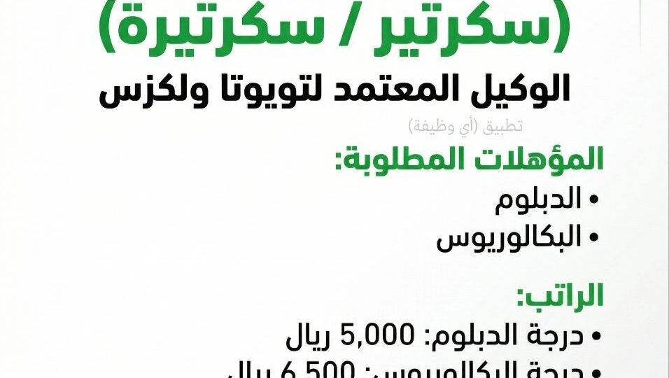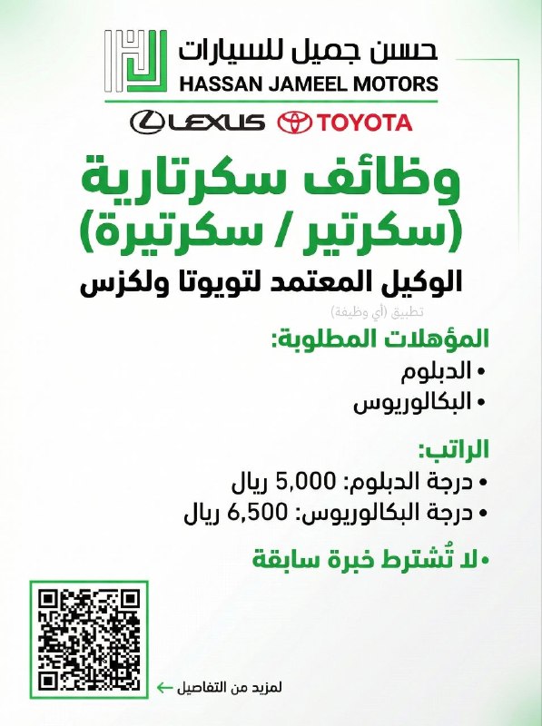 🔴 (توظيف فوري) برواتب (تصل ٦,٥٠٠ ريال) لدى (شركة حسن جميل للسيارات) لدى الوكيل المعتمد لتويوتا ولكزس: