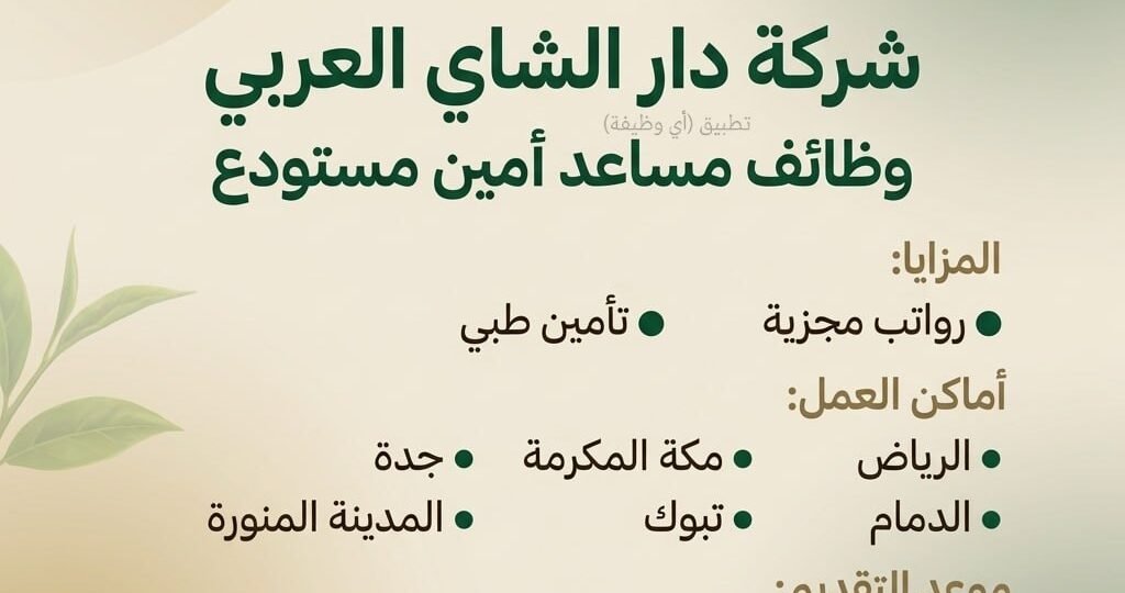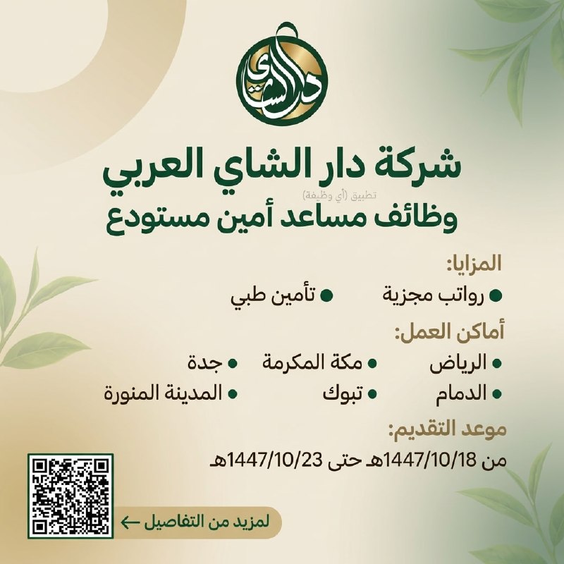 (🔴) توظيف فوري | شركة دار الشاي العربي تعلن توفر وظائف (مساعد أمين مستودع) للسعوديين في مستودعاتها بعدة مناطق: