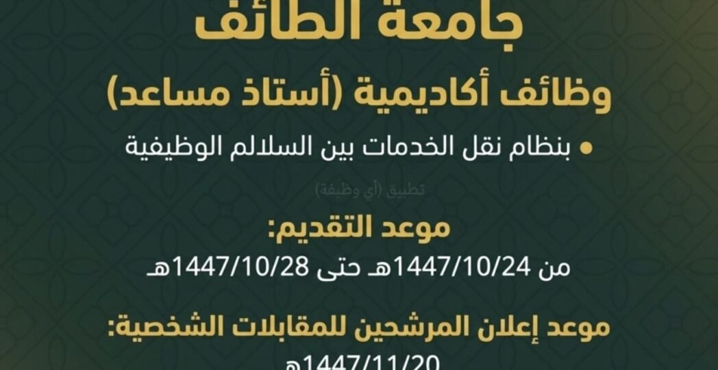 (🔴) جامعة الطائف تعلن وظائف أكاديمية (أستاذ مساعد) بنظام نقل الخدمات: