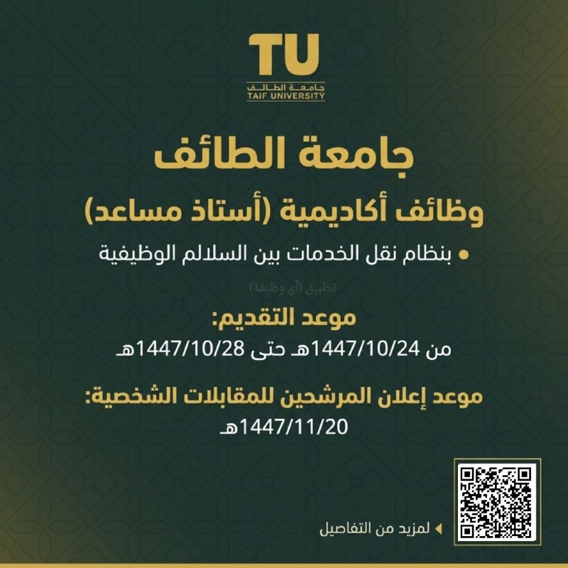 (🔴) جامعة الطائف تعلن وظائف أكاديمية (أستاذ مساعد) بنظام نقل الخدمات: