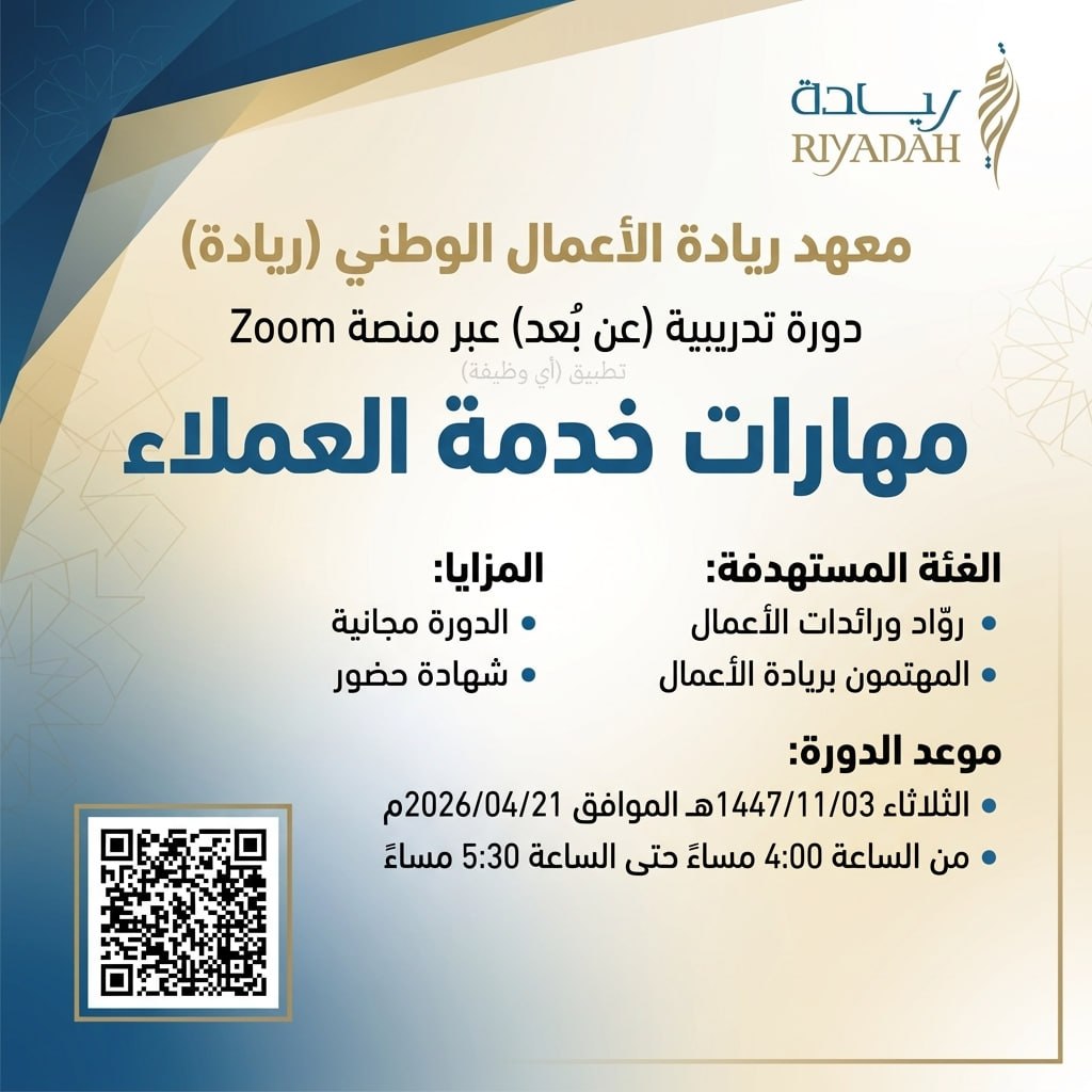معهد ريادة الأعمال الوطني يعلن إقامة دورة بعنوان (مهارات خدمة العملاء) عبر منصة (Zoom)، تُقام الدورة يوم الثلاثاء (١٤٤٧/١١/٤هـ) من الساعة (٤:٠٠ مساءً) إلى الساعة (٥:٣٠ مساءً).