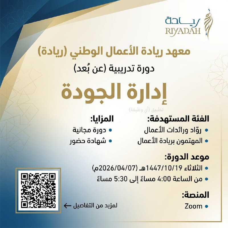 معهد ريادة الأعمال الوطني يعلن إقامة دورة تدريبية مجانية (عن بُعد) عبر منصة (ZOOM) للمهتمين بريادة الأعمال، بعنوان (إدارة الجودة)، تُنفذ الدورة يوم الثلاثاء (١٩ شوال ١٤٤٧هـ) من الساعة (٤:٠٠ مساءً).