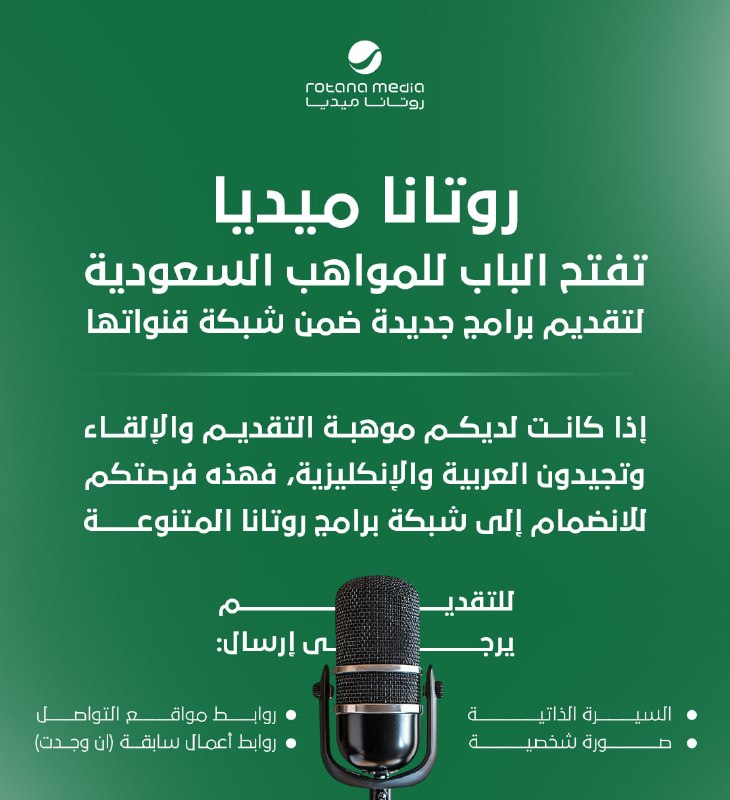 🔴 | روتانا ميديا (أكبر شبكة إعلامية عربية) تفتح الباب للمواهب السعودية لتقديم برامج جديدة ضمن شبكة قنواتها