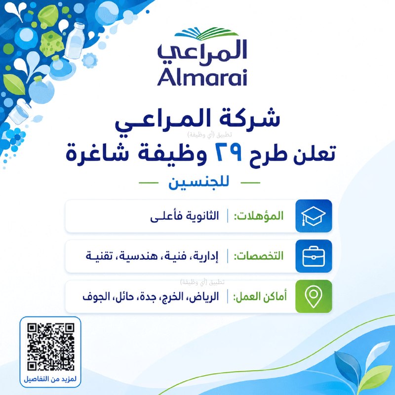(🔴) شركة المراعي تعلن طرح ٢٩ وظيفة شاغرة للجنسين: