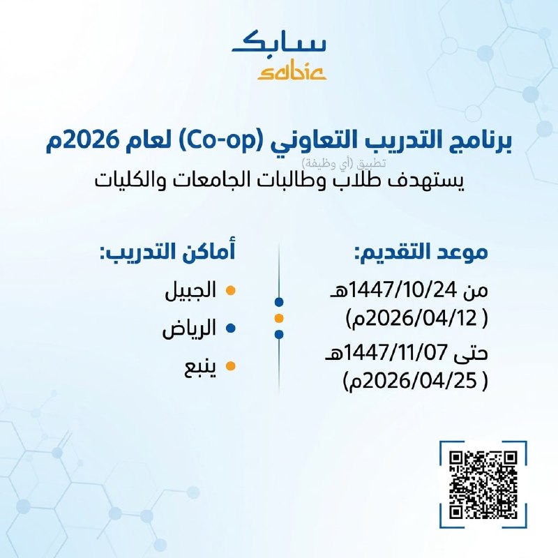 (🔴) شركة سابك (SABIC) تفتح باب التقديم لبرنامج التدريب التعاوني (في عدة مناطق بالمملكة):