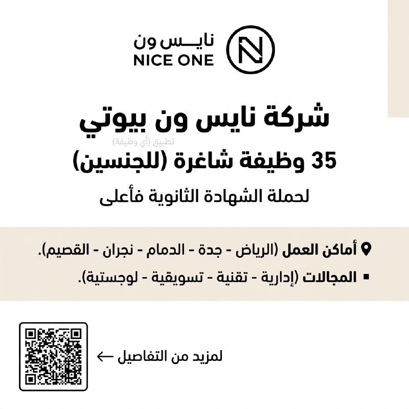 (🔴) شركة نايس ون (٣٥ وظيفة شاغرة) للجنسين في عدة مدن بالمملكة: