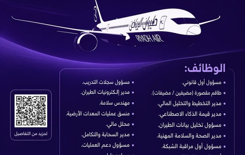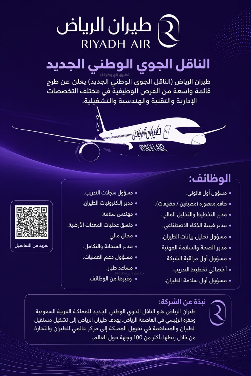 (🔴) طيران الرياض (الناقل الوطني الجديد) يعلن وظائف شاغرة لحملة (الثانوية فأعلى) في مختلف التخصصات: