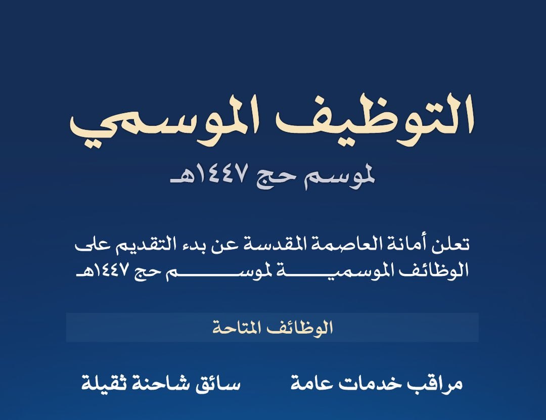 🔴 | عاجل – أمانة العاصمة المقدسة تعلن وظائف موسمية لموسم حج ١٤٤٧هـ لحملة (الثانوية فأعلى)