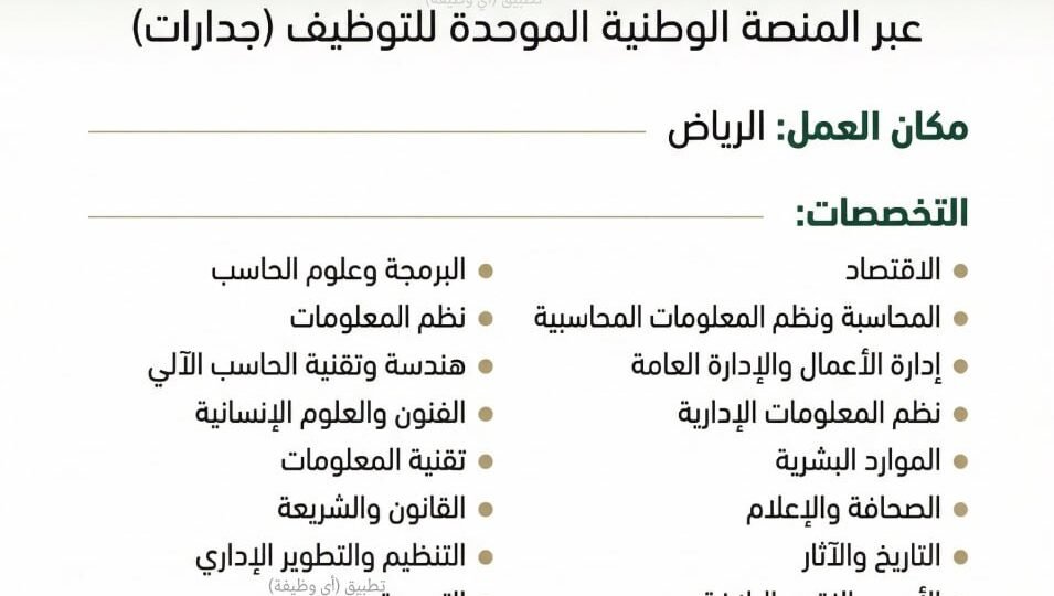 (🔴) عاجل | وظائف حكومية (دارة الملك عبدالعزيز) عبر منصة (جدارات) للرجال والنساء في التخصصات التالية: