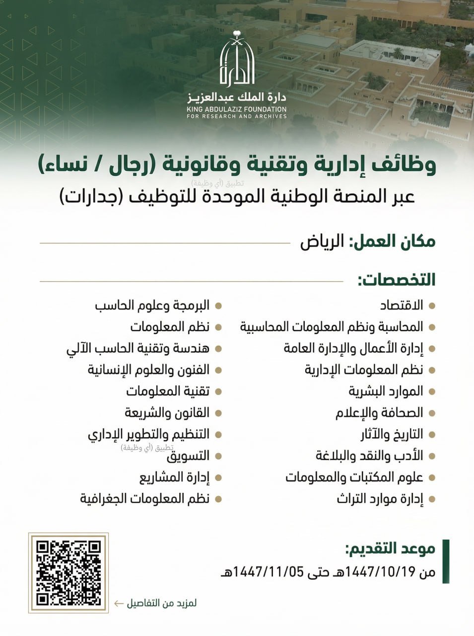 (🔴) عاجل | وظائف حكومية (دارة الملك عبدالعزيز) عبر منصة (جدارات) للرجال والنساء في التخصصات التالية: