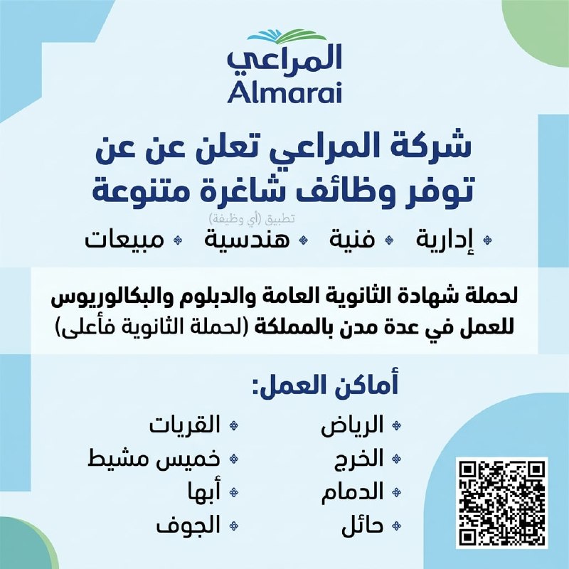 (🔴) فتح التوظيف لدى (شركة المراعي):📘 المؤهلات (الثانوية – الدبلوم – البكالوريوس).