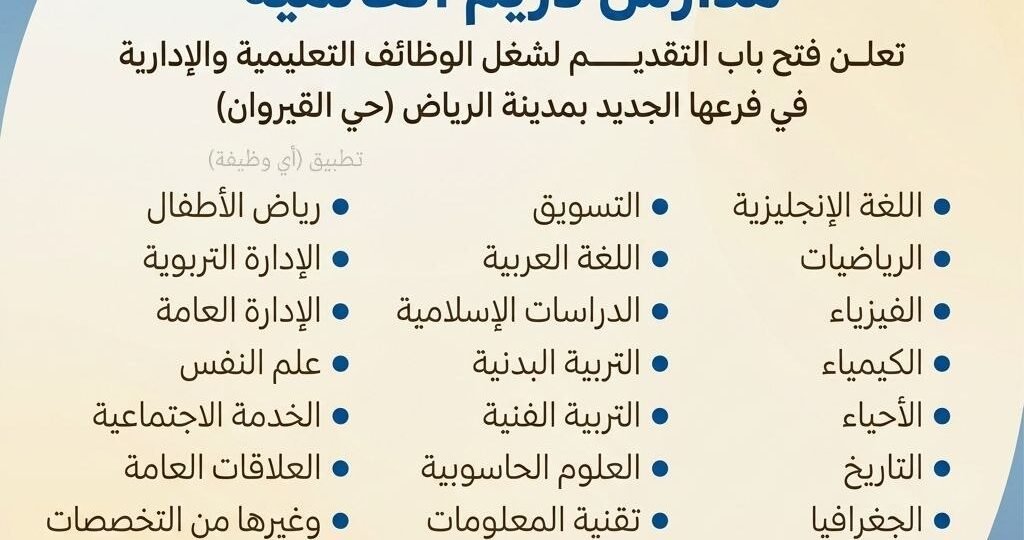 (🔴) مدارس دريم العالمية تعلن وظائف تعليمية وإدارية بفرعها الجديد بالرياض: