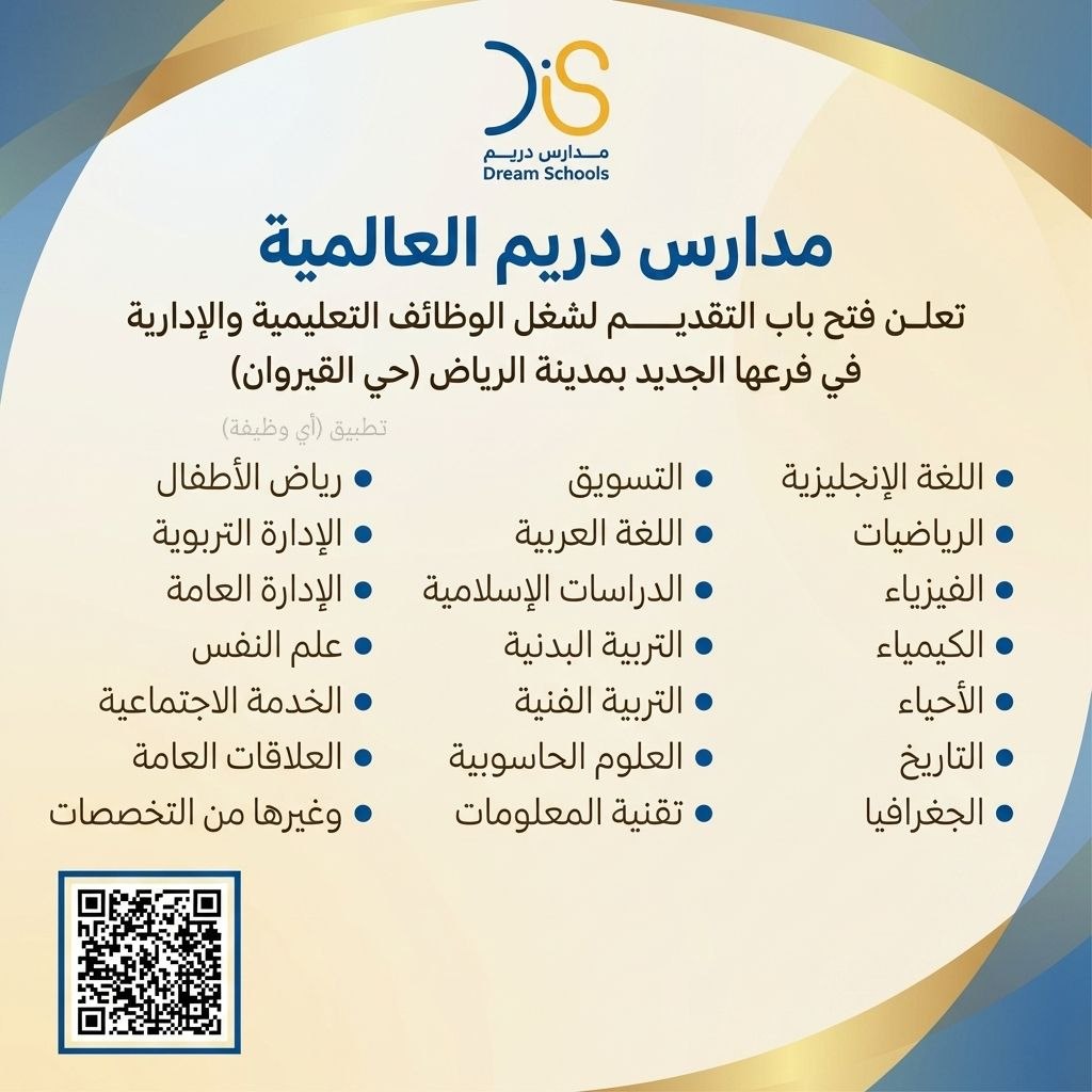 (🔴) مدارس دريم العالمية تعلن وظائف تعليمية وإدارية بفرعها الجديد بالرياض: