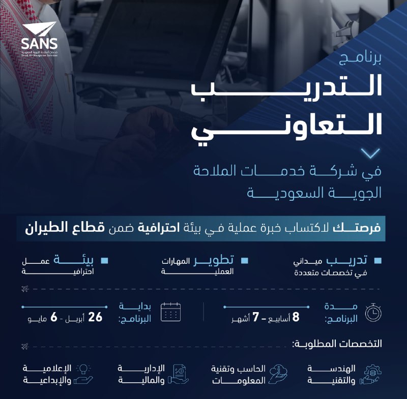 (🔴) هام – خدمات الملاحة الجوية السعودية تعلن بدء التقديم على برنامج (التدريب التعاوني) في مختلف التخصصات والمجالات