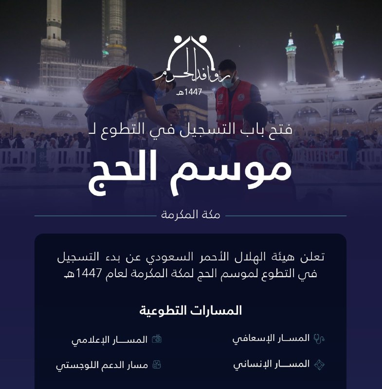 (🔴) هيئة الهلال الأحمر تعلن فتح باب التسجيل في التطوع لخدمة ضيوف الرحمن في موسم حج ١٤٤٧هـ في مكة المكرمة