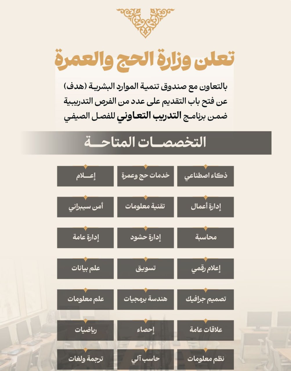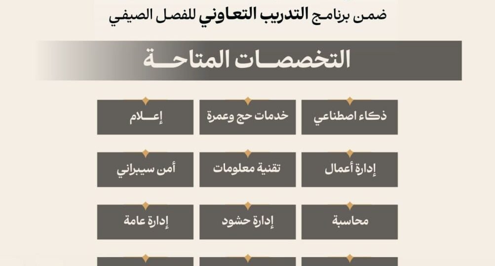 🔴 | وزارة الحج والعمرة تعلن عن فتح باب التقديم على عدد من الفرص التدريبية ضمن برنامج (التدريب التعاوني) للفصل الصيفي