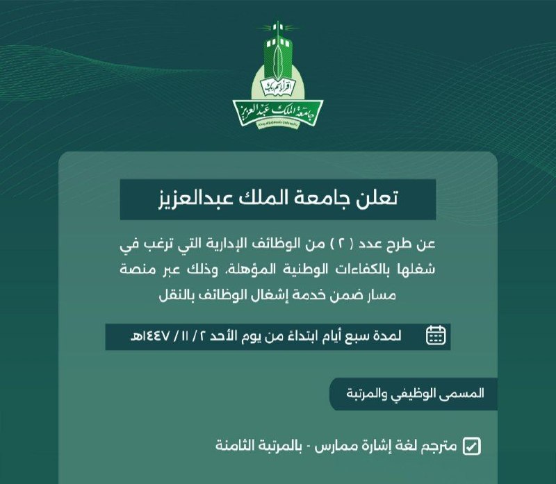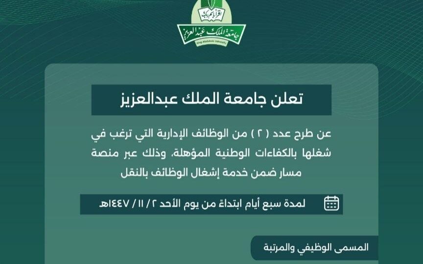 (🔴) وظائف بالمرتبة الثامنة (جامعة الملك عبدالعزيز) بنظام النقل عبر منصة مسار: