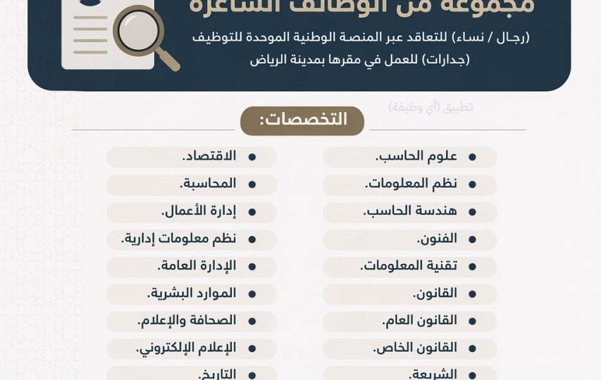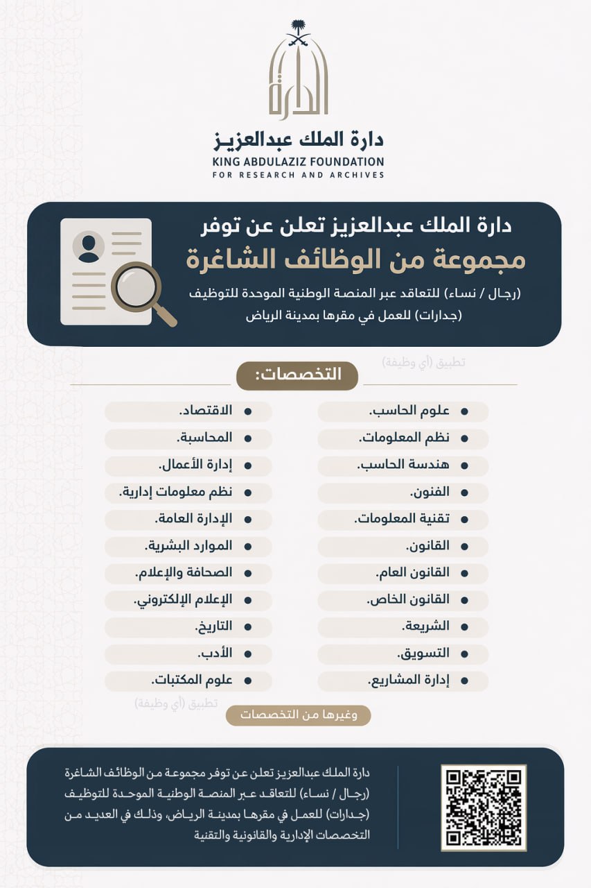 (🔴) وظائف حكومية (دارة الملك عبدالعزيز) عبر منصة (جدارات) للرجال والنساء في التخصصات التالية:
