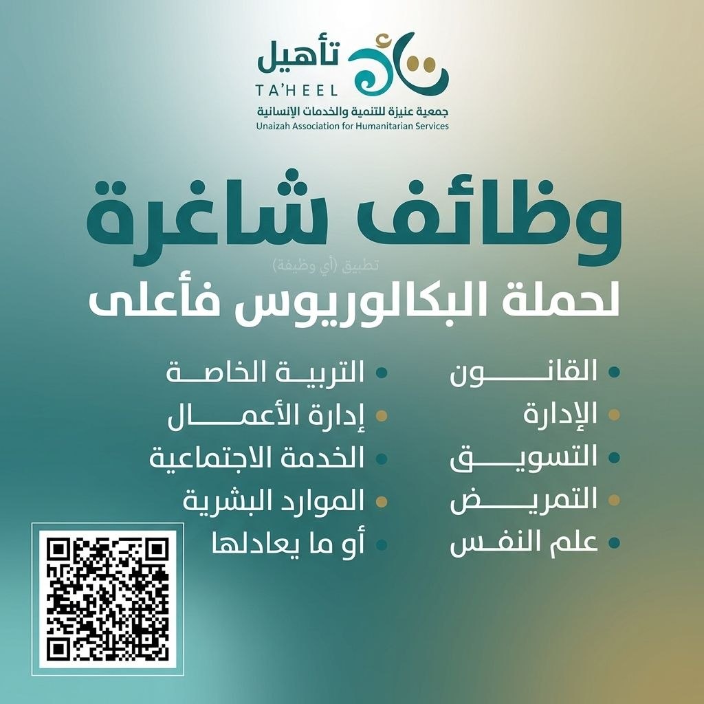 (🔴) وظائف شاغرة لدى جمعية عنيزة للخدمات الإنسانية (تأهيل) لحملة البكالوريوس فأعلى: