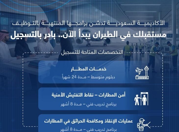 البرامج: (خدمات المطار – أمن المطارات – عمليات الإنقاذ ومكافحة الحرائق) تعلن الأكاديمية السعودية للطيران المدني عن فتح التسجيل للثانوية في برامجها المنتهية بالتوظيف في مطارات المملكة