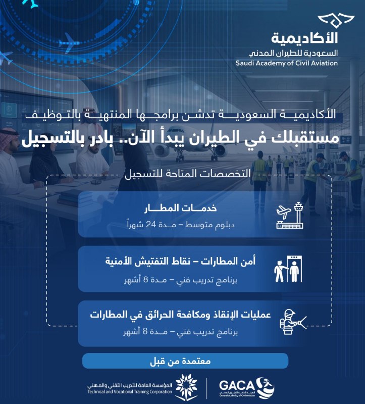 البرامج: (خدمات المطار – أمن المطارات – عمليات الإنقاذ ومكافحة الحرائق) تعلن الأكاديمية السعودية للطيران المدني عن فتح التسجيل للثانوية في برامجها المنتهية بالتوظيف في مطارات المملكة