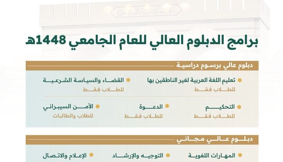 🟠 | الجامعة الإسلامية تعلن فتح باب القبول في برامج الدبلوم العالي (المجانية) و (برسوم دراسية) للطلاب والطالبات للعام الجامعي ١٤٤٨هـ