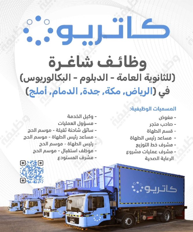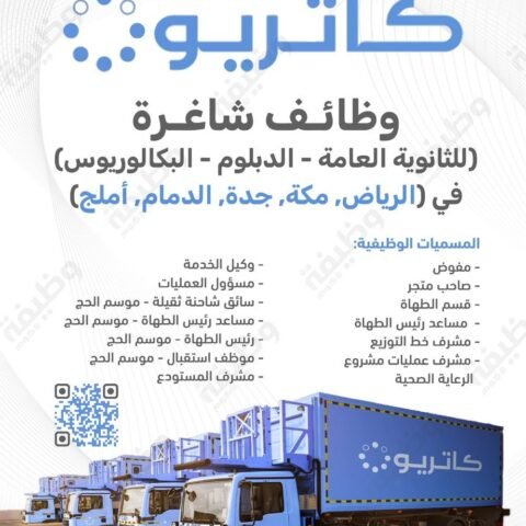 ‏تعلن مجموعة كاتريون (الخطوط السعودية للتموين سابقاً) عن توفر وظائف شاغرة لحملة الثانوية والدبلوم والبكالوريوس للعمل في (الرياض ومكة وجدة والدمام وأملج)
